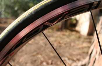 DT Aerolite bladed butted spokes are used, 20 radially on the front, and the 24 in the rear are eight radially on the non-gear side with a small flange and 16 crossed twice on the gear side coming out of a gear side larger flange.